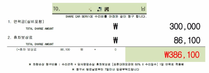 견적서를 받아보니 소규모 렌터카와는 다르게 상당히 양심적으로 수리했다. 나는 면책금 30만원에 해당하는 보험료를 납부했었기 때문에 수리비는 그 이상 나왔지만 30만원만 수리비로 납부했고, 휴차료는 그린카 홈페이지 대여약관에 나와있는 할인이 전혀 없는 '표준대여료'의 50%를 수리 일수 만큼 납부해야 하는데 사고 차량은 1일 만에 수리가 끝났기 때문에 86,100원만 납부했다.